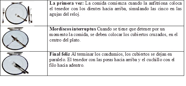 - Cubiertos. Se colocan todos a la vez, alineados por su empuñadura, y acomodados de acuerdo al orden de uso, desde afuera hacia adentro.